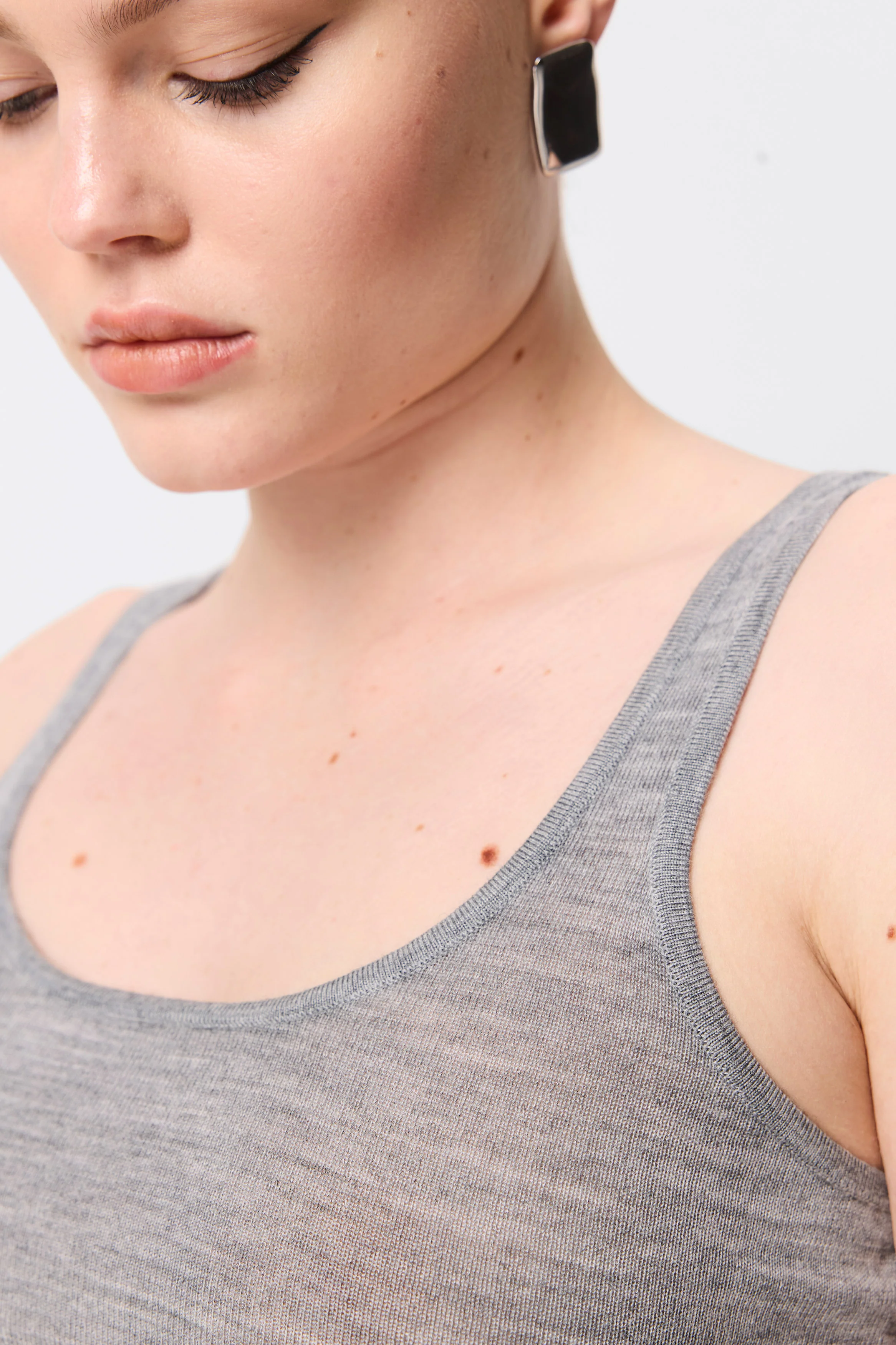 The Arden Tank in Greymarle is a refined essential, designed for everyday wear. Crafted from premium 100% Merino wool, this piece features a body-skimming fit with a flattering scoop neckline and wide straps for effortless versatility. Its minimalist silhouette makes it the perfect base for layering or a chic standalone option. Transition seamlessly from casual looks to elevated ensembles with this timeless wardrobe staple.