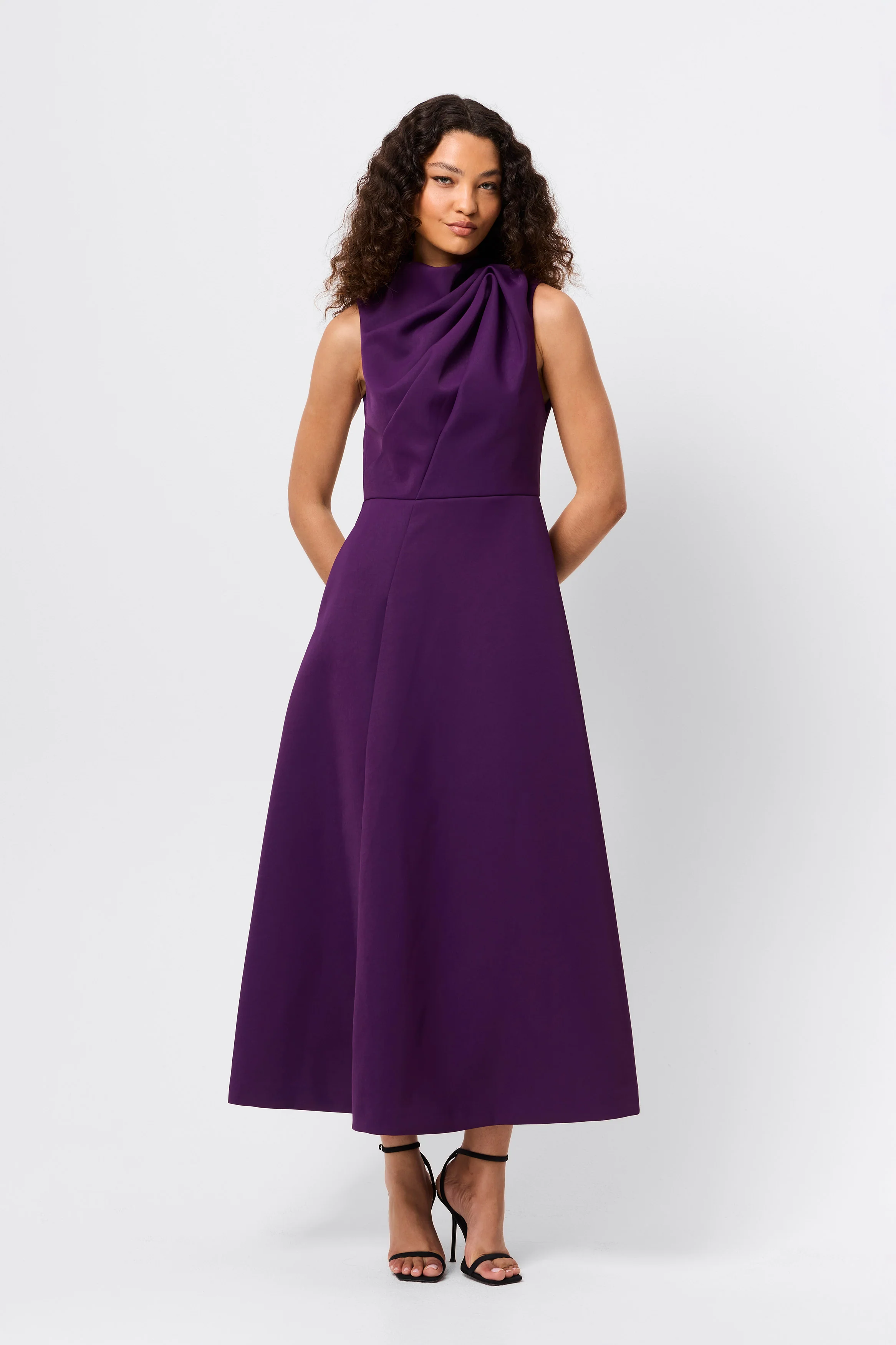 - Asymmetric draped neckline detail with shoulder tucks
