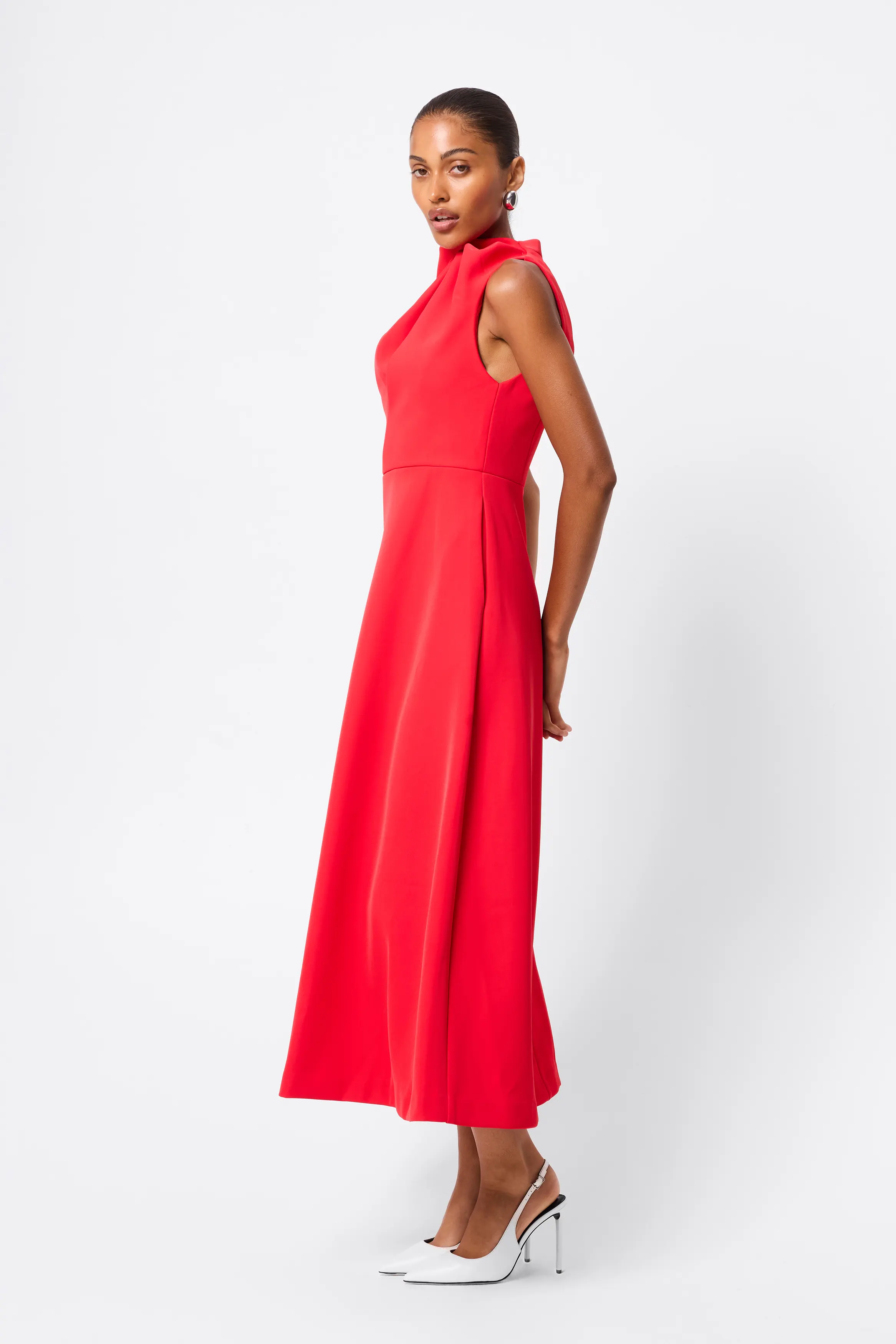 - Asymmetric draped neckline detail with shoulder tucks