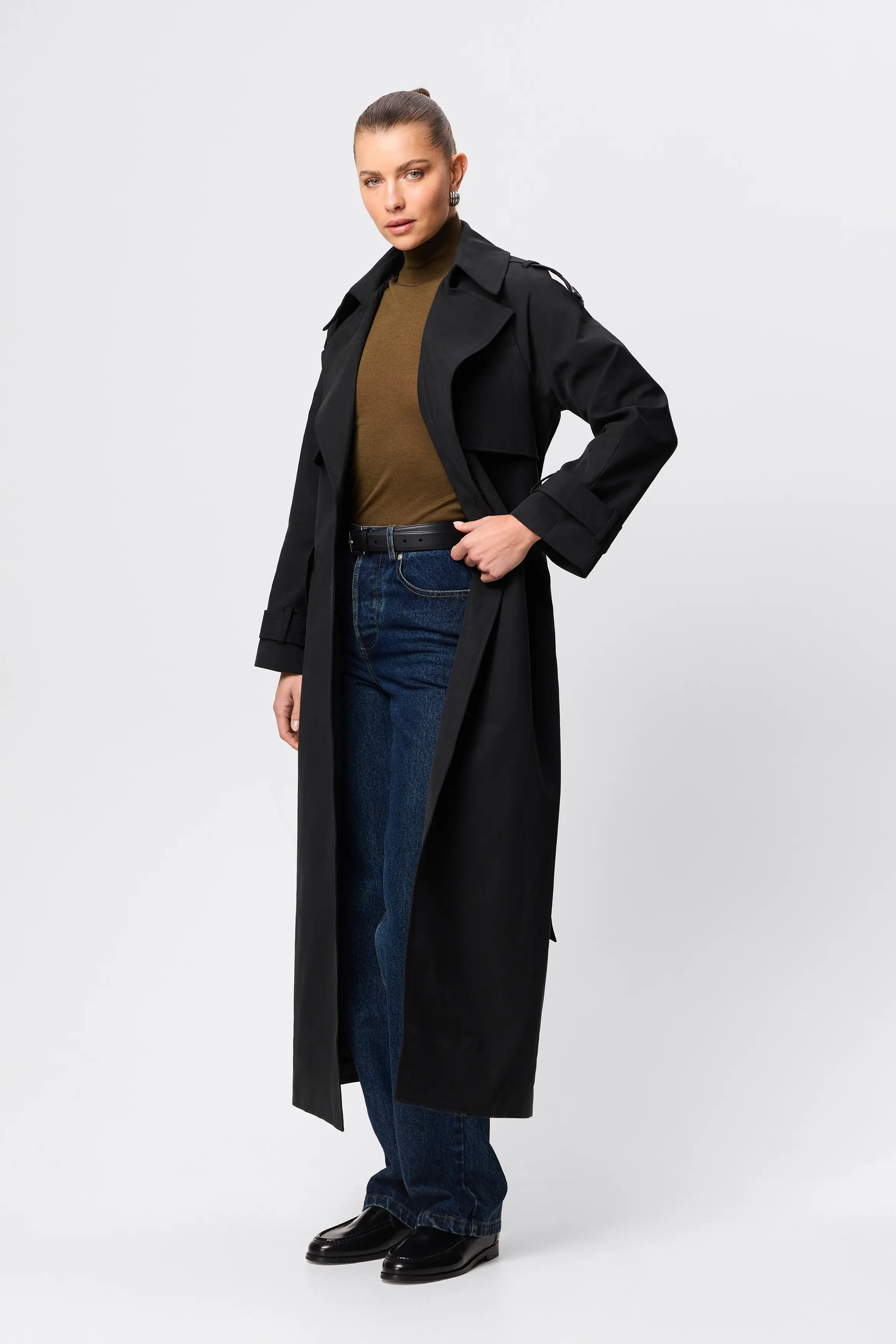 A modern take on a classic, the Franklin Trench Coat in Black is a versatile must-have. With its relaxed fit, structured collar, and self-tie waist, it offers effortless sophistication. Wear it with jeans and a tee for everyday ease or drape it over a dress for timeless appeal. Size down for a more tailored fit.