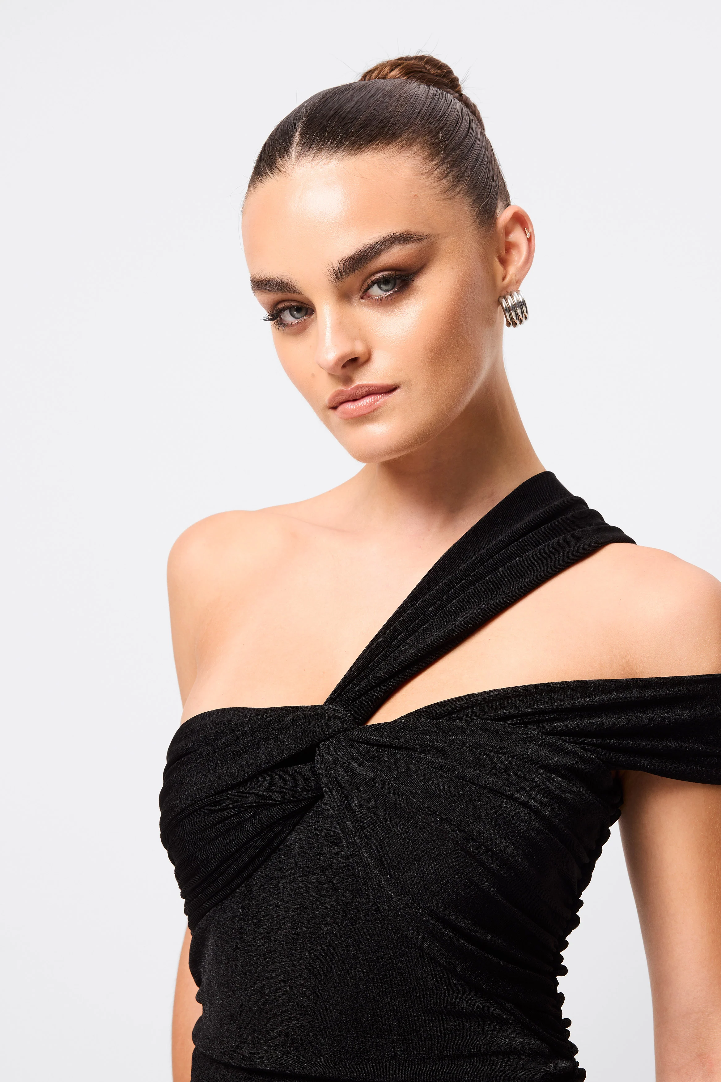 Make a statement in the One More Time Maxi Dress in Black. Crafted from a soft, stretch Lycra fabrication with a subtle sheen, this form-fitting silhouette features an asymmetric one-shoulder neckline with a draped tie detail for a flattering finish. A knotted front bust accent adds definition, while side ruching along the torso contours the body and enhances every shape. Designed to turn heads, this event-ready style balances bold detail with refined elegance.