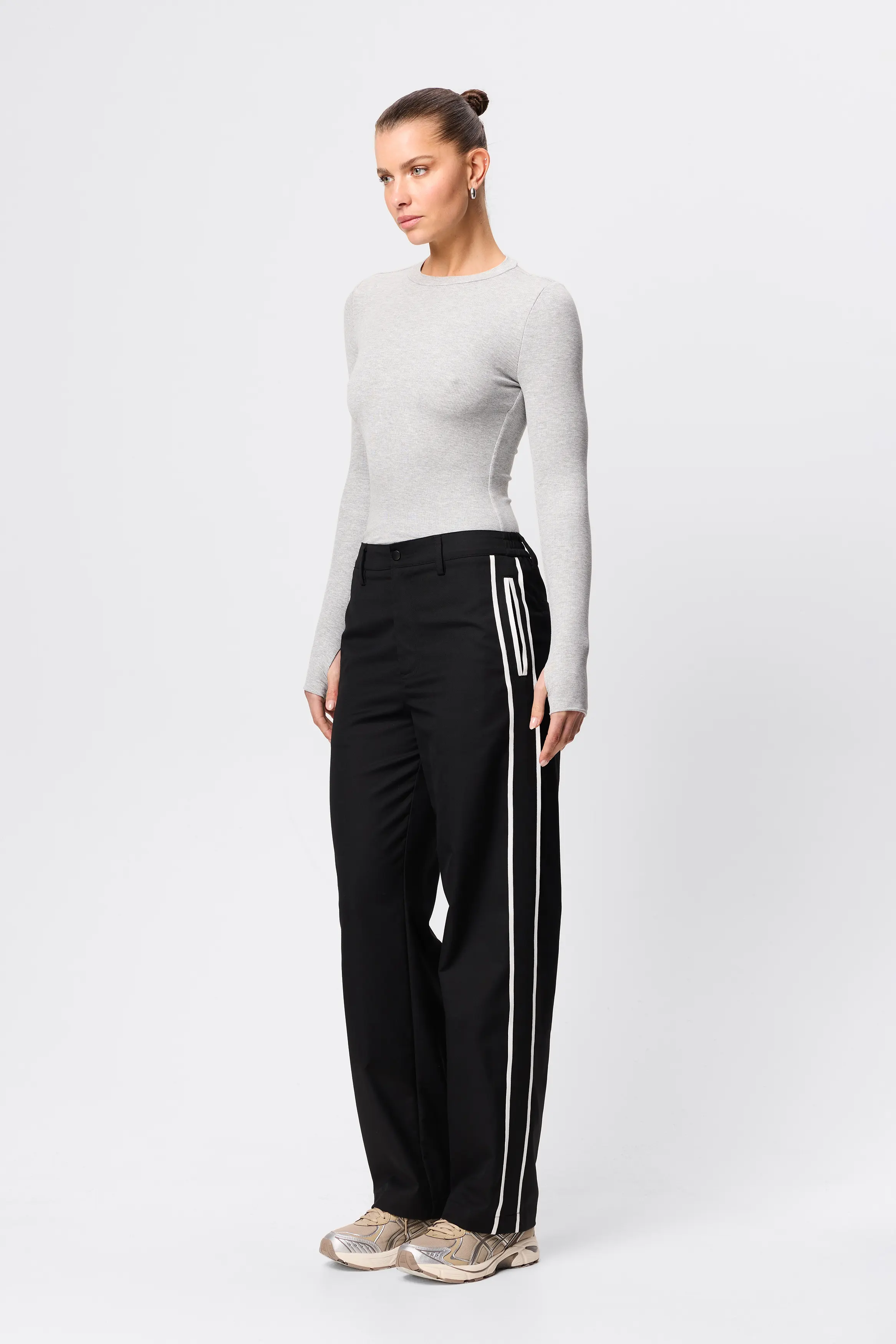 - Straight relaxed leg with contrast side stripe